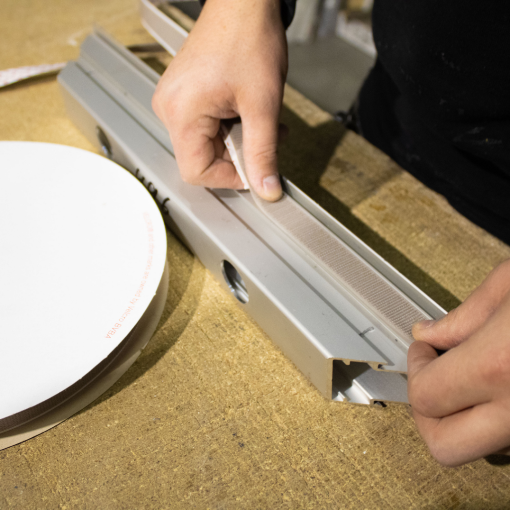Des bandes Velcro d’une largeur de 20 mm et 25 mm (selon capacité de charge) sont généralement recommandées pour les cadres Aluvision pour la fixation des panneaux d’habillage. Ces bandes Velcro peuvent être coupées à la longueur souhaitée puis fixées aussi bien au cadre qu’au verso du panneau d’habillage.